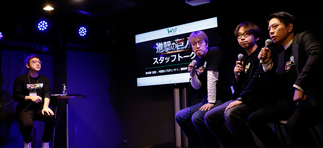 イベントの一つである『進撃の巨人』スタッフトークには、WIT STUDIO代表取締役の和田丈嗣氏、プロデューサーの中武哲也氏、総監督の荒木哲郎氏、キャラクターデザインの浅野恭司氏が登壇。和田氏の司会でトークがスタートした。