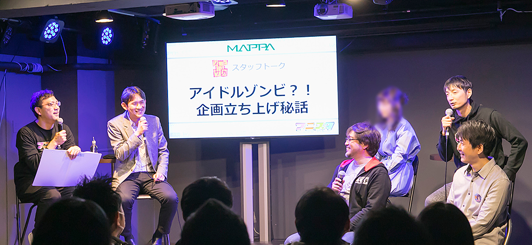 イベントの一つである『ゾンビランドサガ』スタッフトークには、MAPPA代表取締役の大塚学氏、Cygamesのプロデューサー・竹中信広氏、監督の境宗久氏、シリーズ構成・脚本の村越繁氏、キャラクターデザインの深川可純氏が登壇。イベント全体を主催するWIT STUDIO代表取締役の和田丈嗣氏が司会を務め、トークがスタートした。