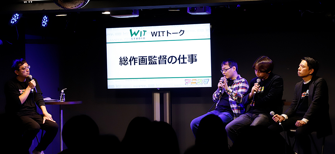 イベントの一つである『WITトーク』には、WIT STUDIOの代表取締役・和田丈嗣氏、プロデューサーである中武哲也氏、アニメーターの浅野恭司氏と門脇聡氏が登壇。和田氏の司会にてトークがスタートした。