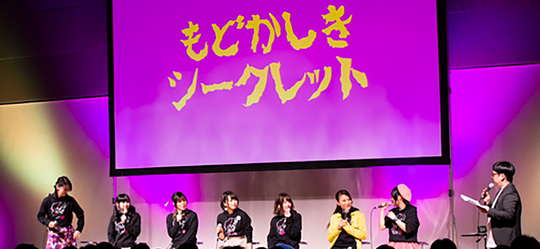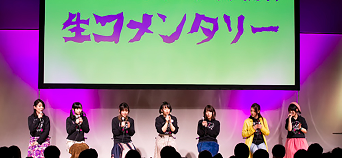 2月10日(日)ミーティングデー・ベルサール秋葉原ステージの「MAPPA『ゾンビランドサガ』キャストトーク 1回目」には、作品発のユニット・フランシュシュより源さくら役の本渡楓さん、星川リリィ役の田中美海さん、二階堂サキ役の田野アサミさん、水野愛役の種田梨沙さん、紺野純子役の河瀬茉希さん、ゆうぎり役の衣川里佳さん、山田たえ役の三石琴乃さんが登壇。お笑い芸人の天津 向氏のMCでイベントは進行した。